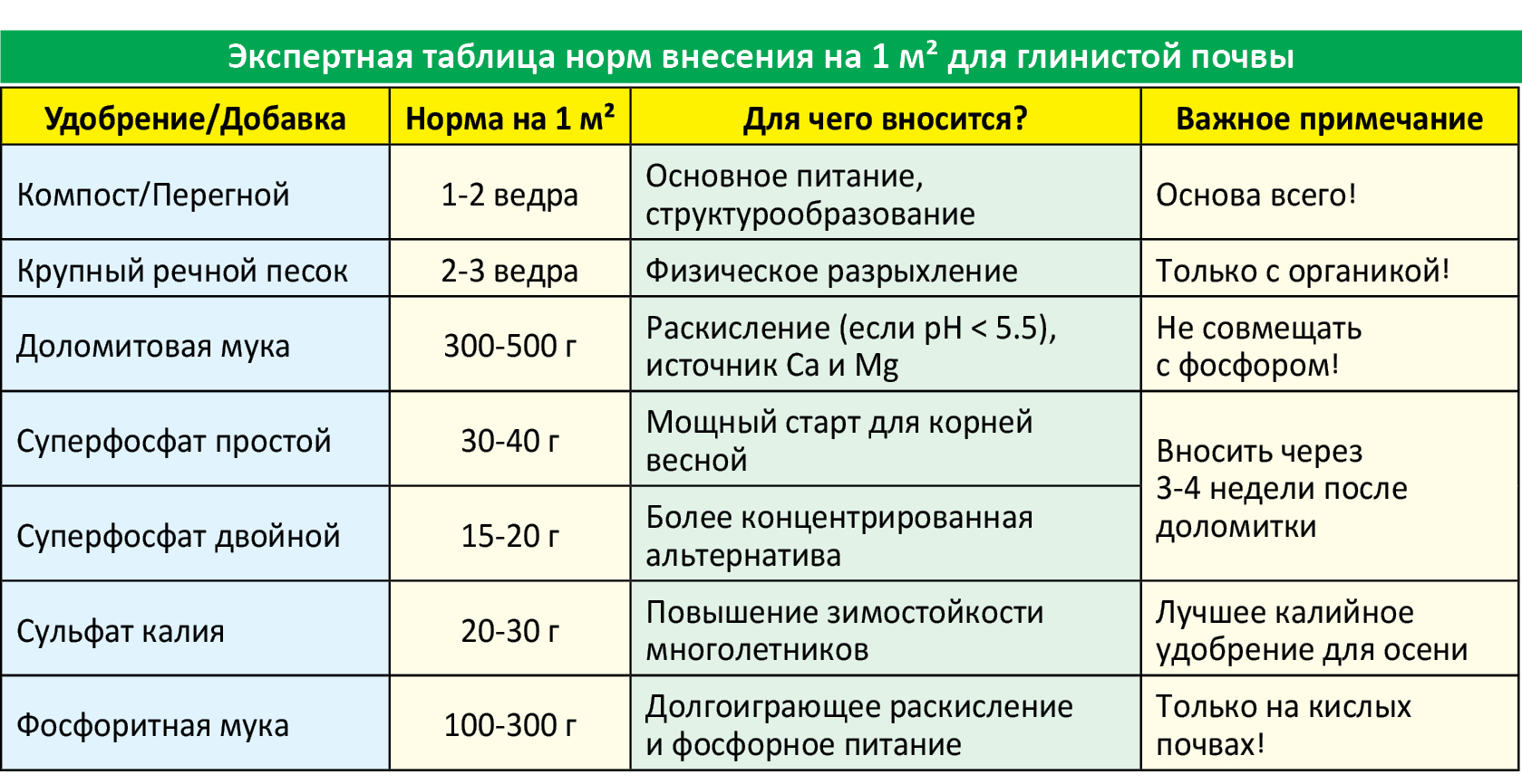 Экспертная таблица норм внесения на 1 м² для глинистой почвы